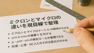 切削加工の現場で迷うミクロンマイクロ違いを、μmとmm換算やゼロ3つの覚え方から、μ/μm/um表記、図面の混在注意、公差の読み替え、マイクロメータとの混同、NC入力の桁ミス対策まで網羅。ミクロンマイクロ違いの不安を解消し、確認ポイントが身につきます。